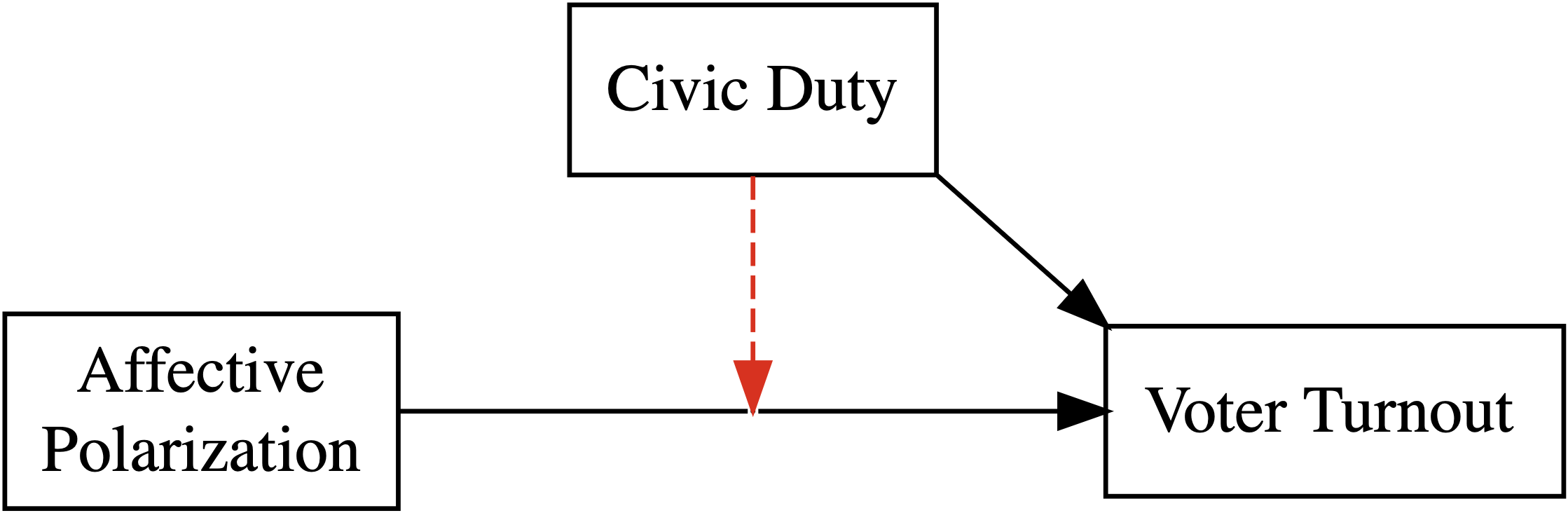 During the Specialization phase of my research master program (fall 2025), I explored affective polarization, civic duty, and voter turnout (see Figure 1). Previous research has looked at affective polarization and voter turnout, and civic duty and voter turnout. My research used the 2020 ANES Time Series Study to look at both affective polarization and civic duty as two predictors of turnout.