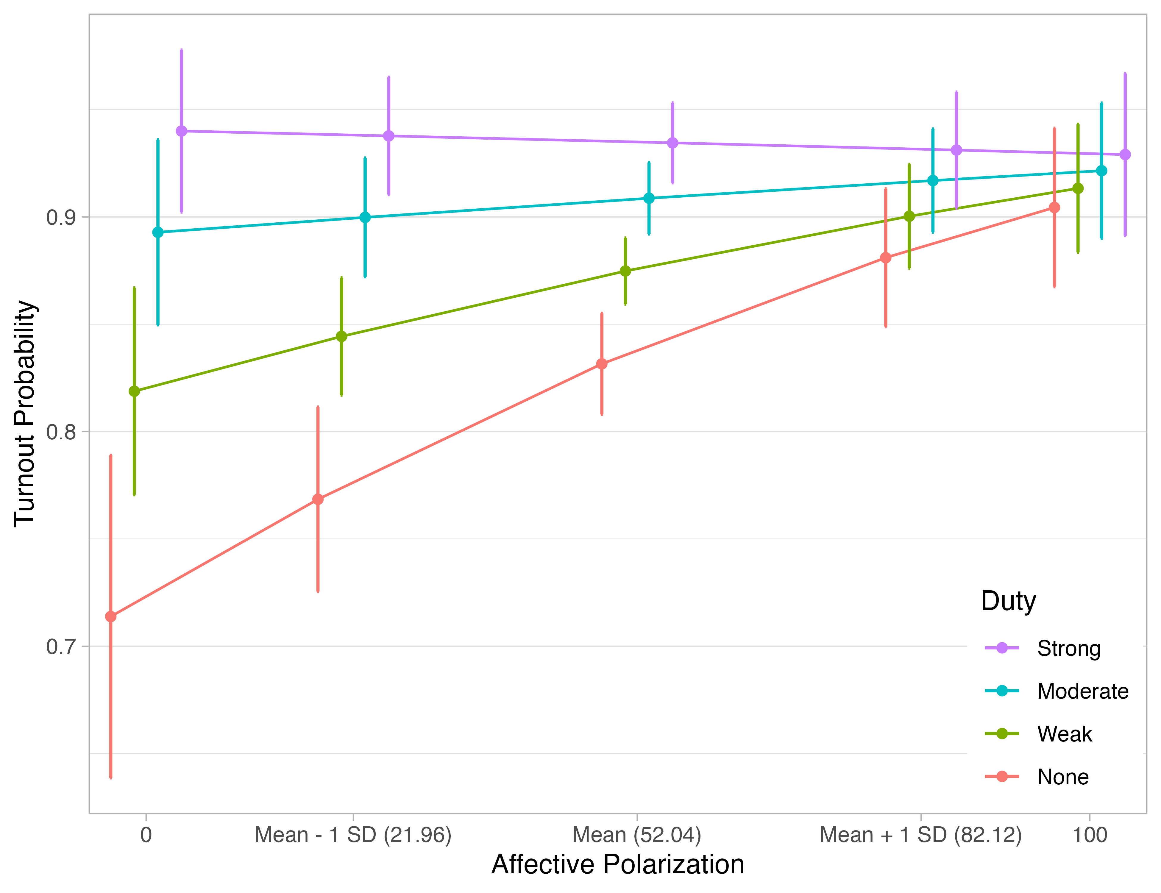I found that the influence of civic duty on turnout varies at different degrees of affective polarization. Figure 2 shows that affective polarization and a (strong) sense of civic duty were associated with greater probabilities of voting, but a strong sense of duty alone was also associated with a greater probability of voting, even when affective polarization was absent or minimal.